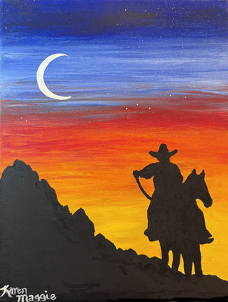 During this class we will learn about acrylic paints, how to use them, and why. You will learn about various brushes, canvas to paint on, types of varnish, and the use of pens, color mixing, basting, and blending will be taught as we paint a simple acrylic design: “Cowboy Sunset.”