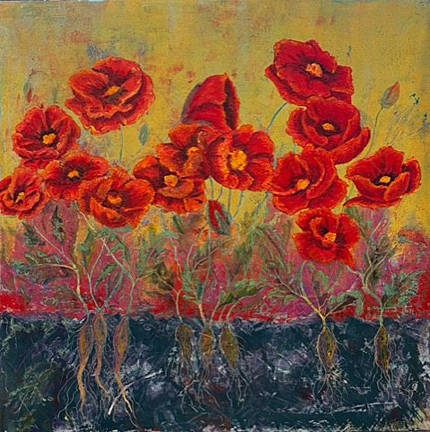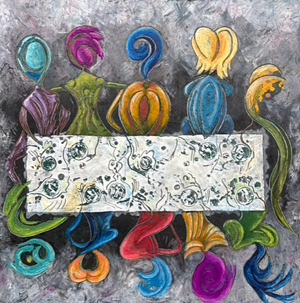 We will work with a triadic color scheme applying and compressing the paint in many layers. We will mask out areas, use stencils, carve out areas and impress textures. We will work with silicone applicators, palette knives and brayers.